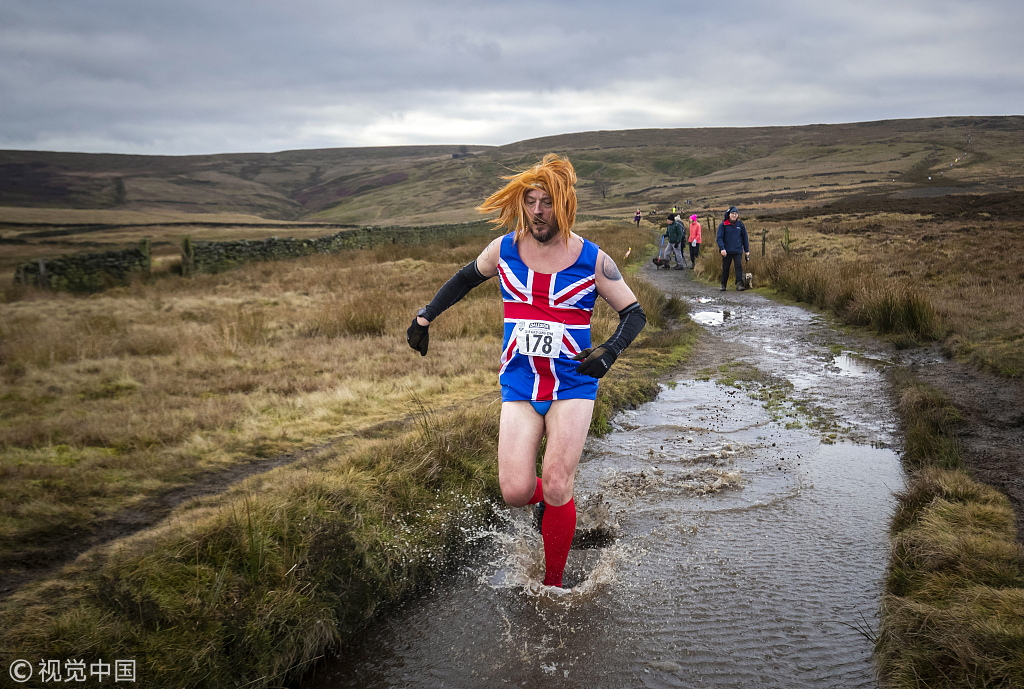 当地时间2018年12月31日,英国哈沃斯,民众身穿奇装异服参加一年一度的Auld Lang Syne Fell越野赛跑。