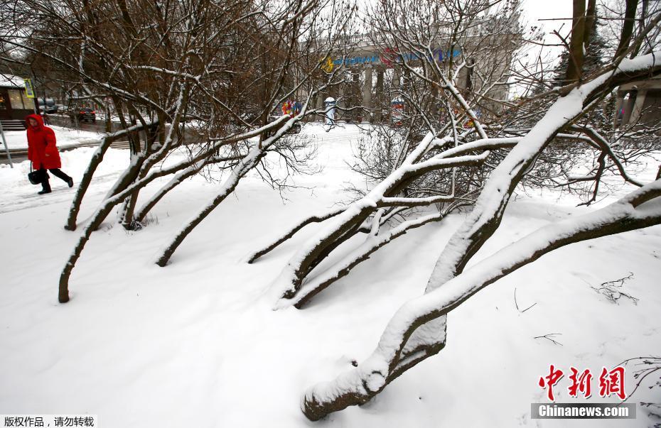 当地时间2019年1月3日,欧洲多地迎来降雪天气,大雪将城市变成了一个个浪漫的冰雪世界。图为大雪覆盖了白俄罗斯明斯克街头的树木。