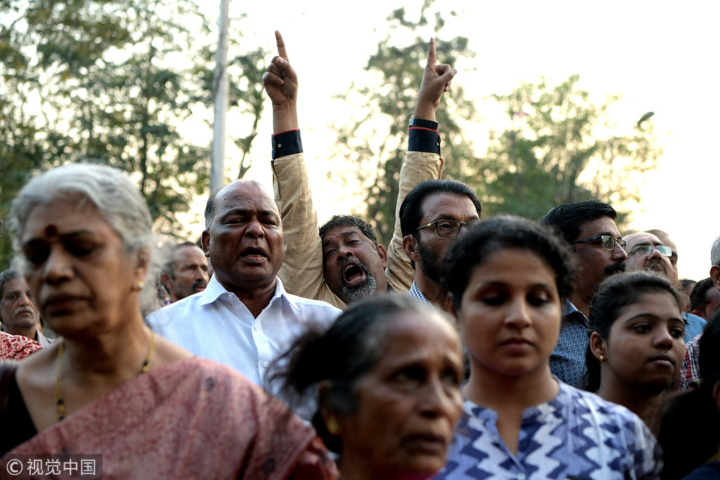 当地时间2019年1月3日,印度孟买,民众集会抗议政府于1月2日让两名印度女性在警察保护下潜入一座印度教神庙,突破多年来禁忌,此举引发保守派人士示威。
