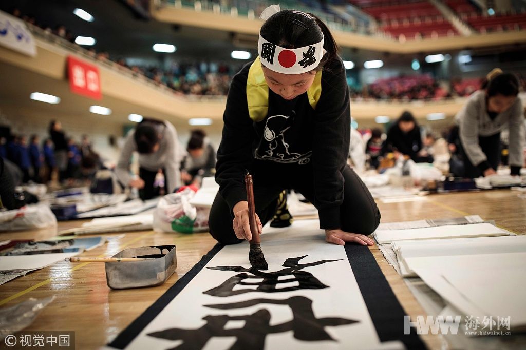 东京举办新年书法大赛 多人挥毫泼墨场面壮观