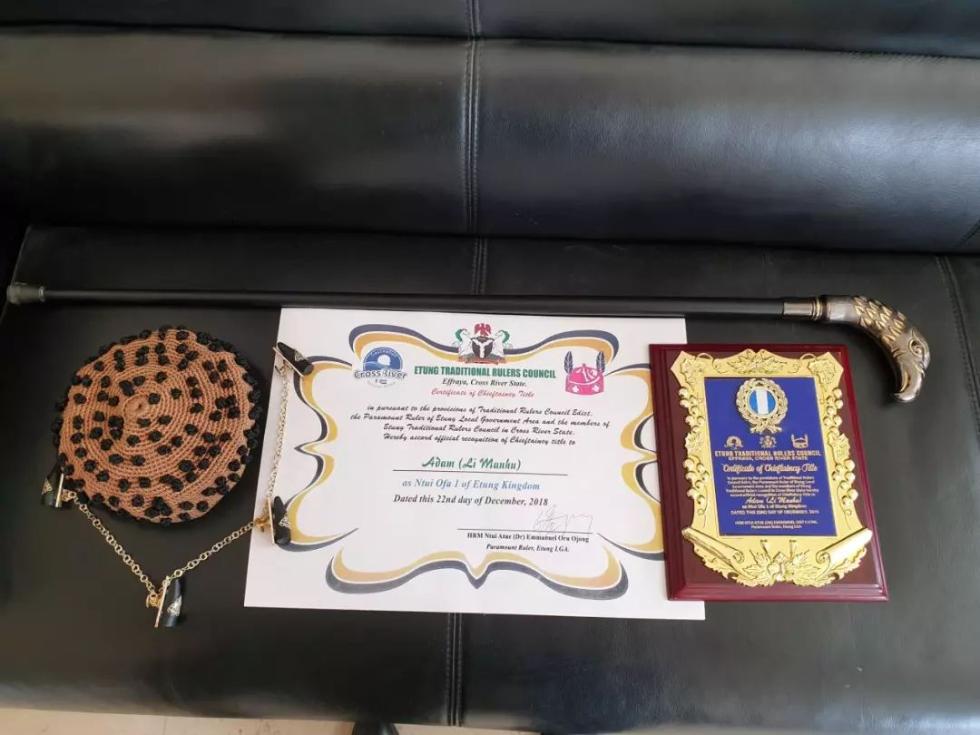 在西非国家尼日利亚工作的中国“90后”小伙李满虎,怎么也没想到自己在2018年岁末,会收到一份特殊的礼物——获封“酋长” 。