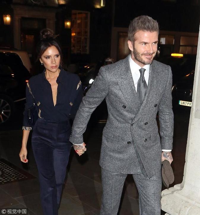 2019秋冬伦敦男装周GQ晚宴,贝嫂全黑look霸气,小贝牵手甜蜜依旧。