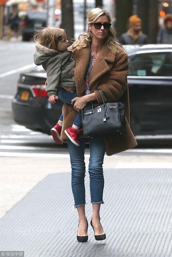 当地时间2019年1月7日,纽约,妮基·希尔顿(Nicky Hilton)抱娃现身街头。