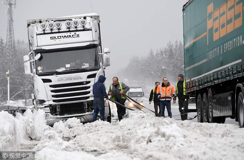 德国遭暴雪袭击 车辆出行受阻交通事故频发