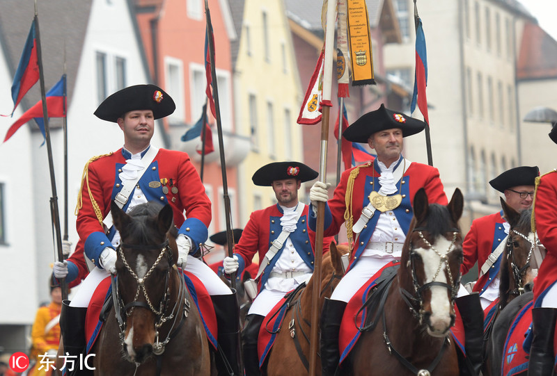 德国养马人参加传统冬季“冷市” 盛装骑马巡游