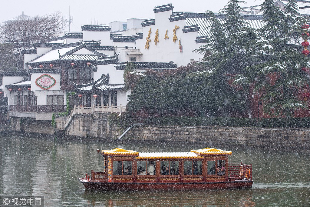 2019年1月9日清晨,南京迎来2019年首场降雪,街头大雪纷飞,车辆上都覆盖了白雪,出行的市民身上也有不少积雪,秒变“雪人”。