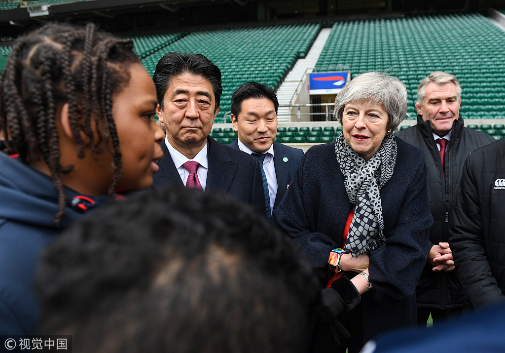 当地时间2019年1月10日,英国伦敦,英国首相特蕾莎·梅和日本首相安倍晋三一同参观特威克纳姆橄榄球馆(Twickenham Rugby Stadium)和世界橄榄球博物馆(World Rugby Museum)。