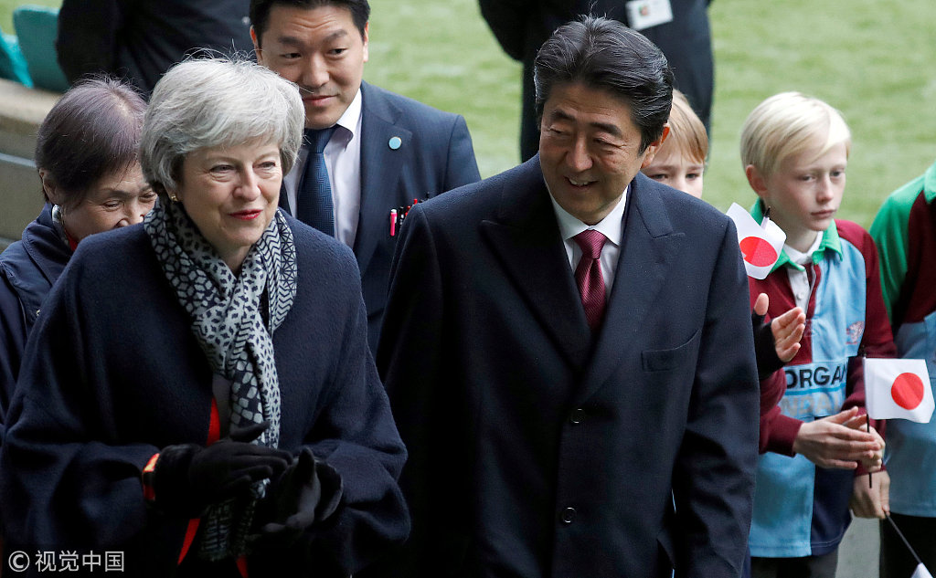 当地时间2019年1月10日,英国伦敦,英国首相特蕾莎·梅和日本首相安倍晋三一同参观特威克纳姆橄榄球馆(Twickenham Rugby Stadium)和世界橄榄球博物馆(World Rugby Museum)。