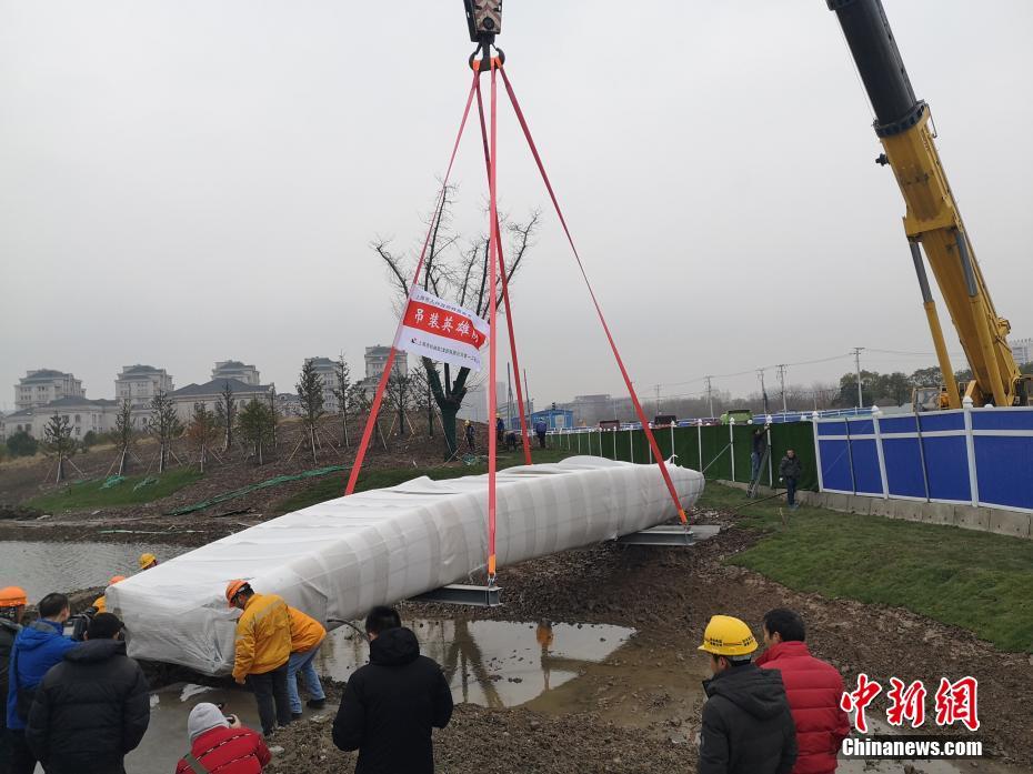 1月11日,国内第一座运用3D打印技术一次成型的景观桥在上海桃浦中央绿地落成。据悉,该桥长15.25米,宽3.8米,高1.2米,由高分子材料仅用35天制作完成,使用寿命达30年。资料图为3D打印桥整体安装。中新社发 申海 摄