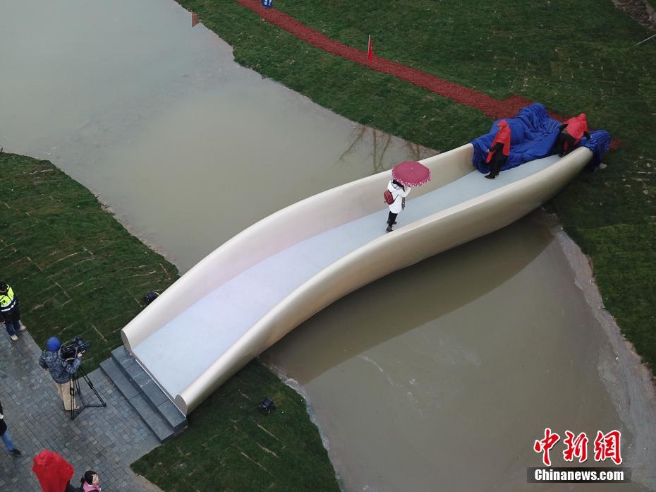 1月11日,国内第一座运用3D打印技术一次成型的景观桥在上海桃浦中央绿地落成。据悉,该桥长15.25米,宽3.8米,高1.2米,由高分子材料仅用35天制作完成,使用寿命达30年。图为3D打印桥亮相桃浦中央绿地。中新社记者 张亨伟 摄
