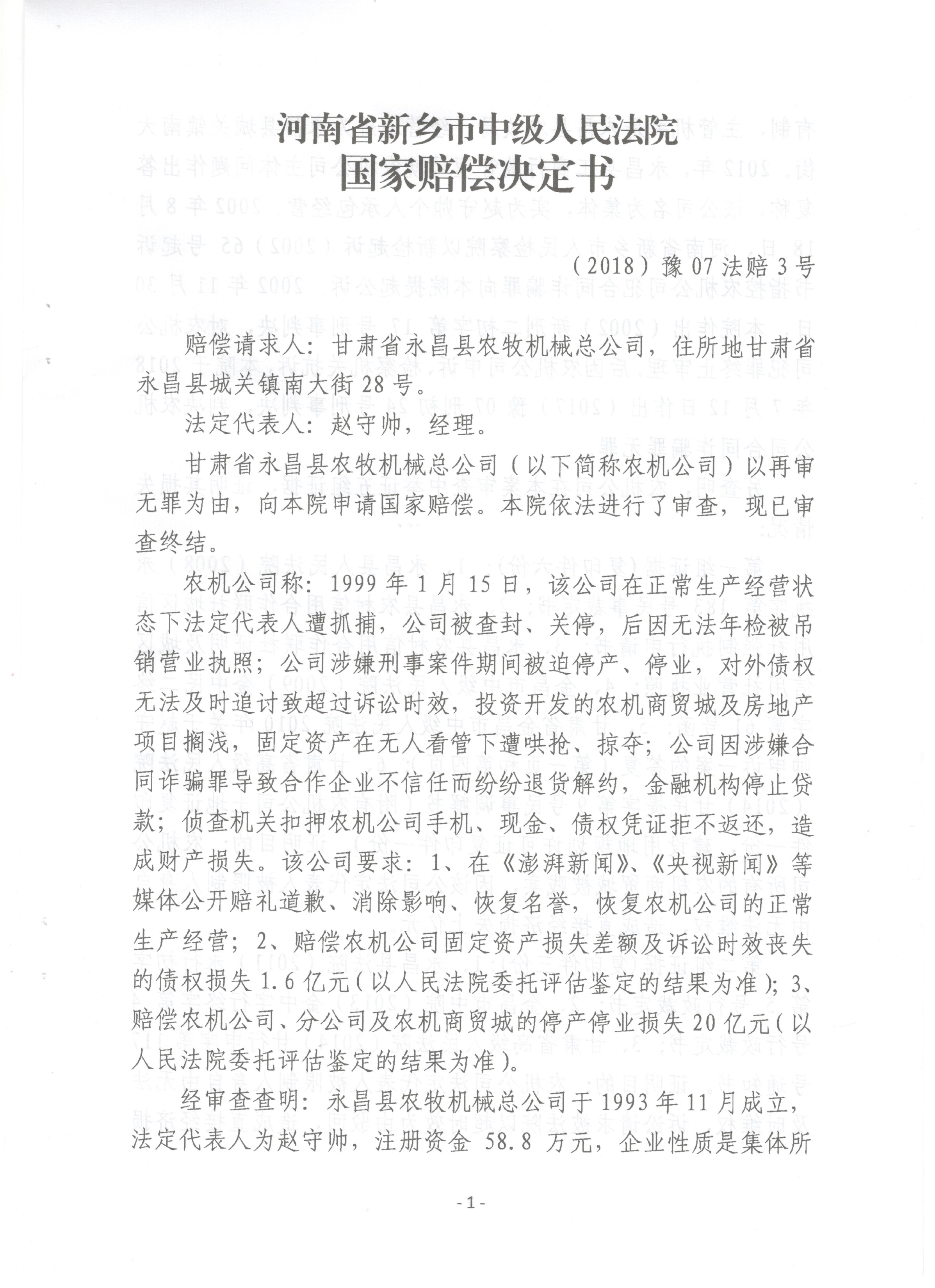 2018年12月30日,河南省新乡市中级人民法院作出的《国家赔偿决定书》称:“现有证据不能证明该院存在侵犯该公司财产权的问题,也不能证明该公司所主张的损失与本院的审判行为存在直接因果关系,对赔偿请求不予支持。”最终决定驳回请求,不予赔偿。