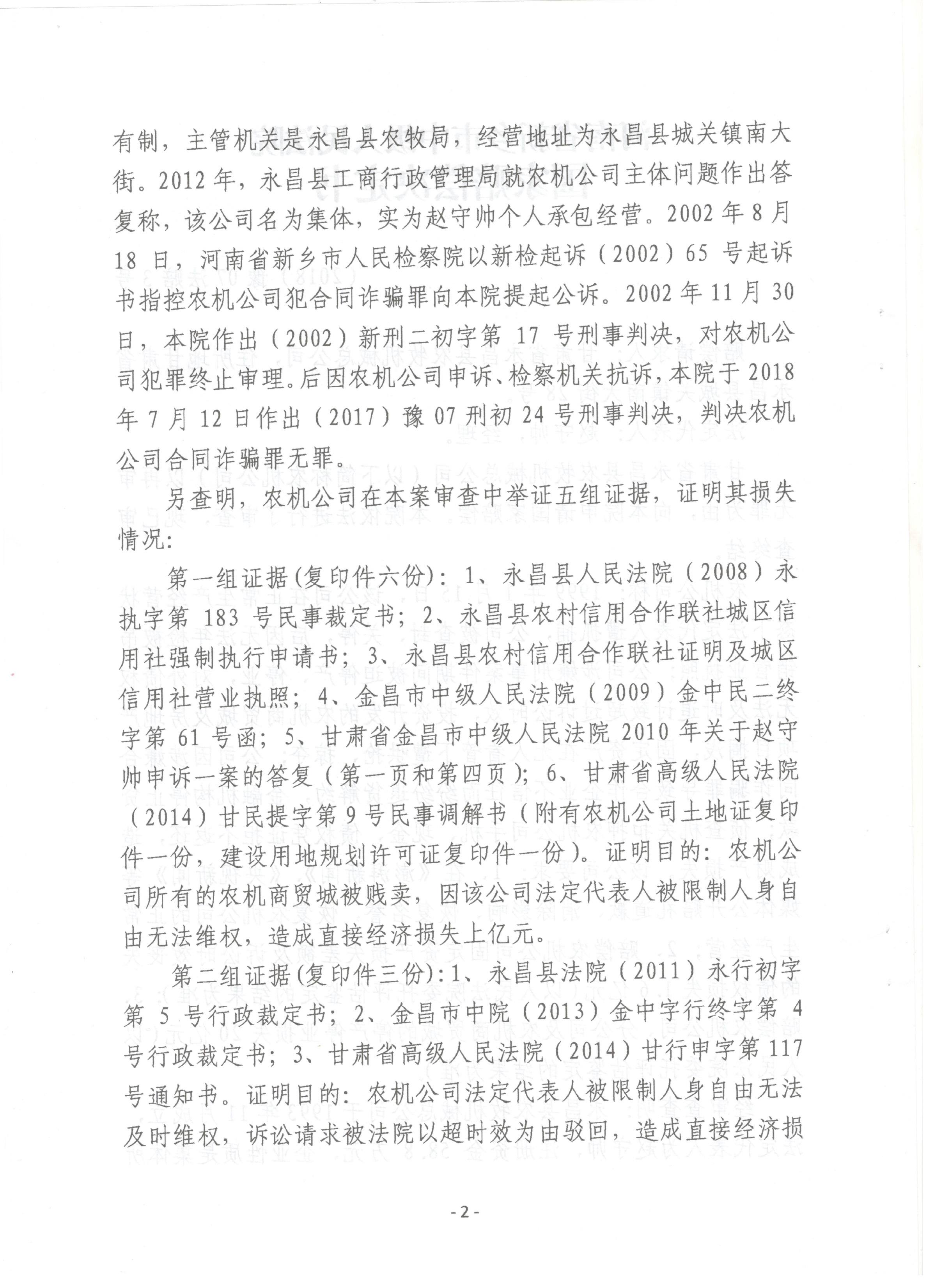 2018年11月20日,赵守帅就企业损失赔偿问题,向新乡中院提交了国家赔偿申请书。赵守帅在申请中称:“公司在正常生产经营状态下,法定代表人遭抓捕,公司被查封、关停,后因无法年检被吊销营业执照。公司在涉刑事案件期间,被迫停产、停业,对外债权无法即使追讨致超过诉讼时效,投资开发的农机商贸城及房地产项目搁浅,固定资产在无人照看的情况下找到哄抢、掠夺,公司因涉嫌合同诈骗导致合作企业不信任而纷纷退货解约,金融机构停止贷款、侦查机关扣押农机公司手机、现金、债权凭证拒不返还,造成财产损失。”