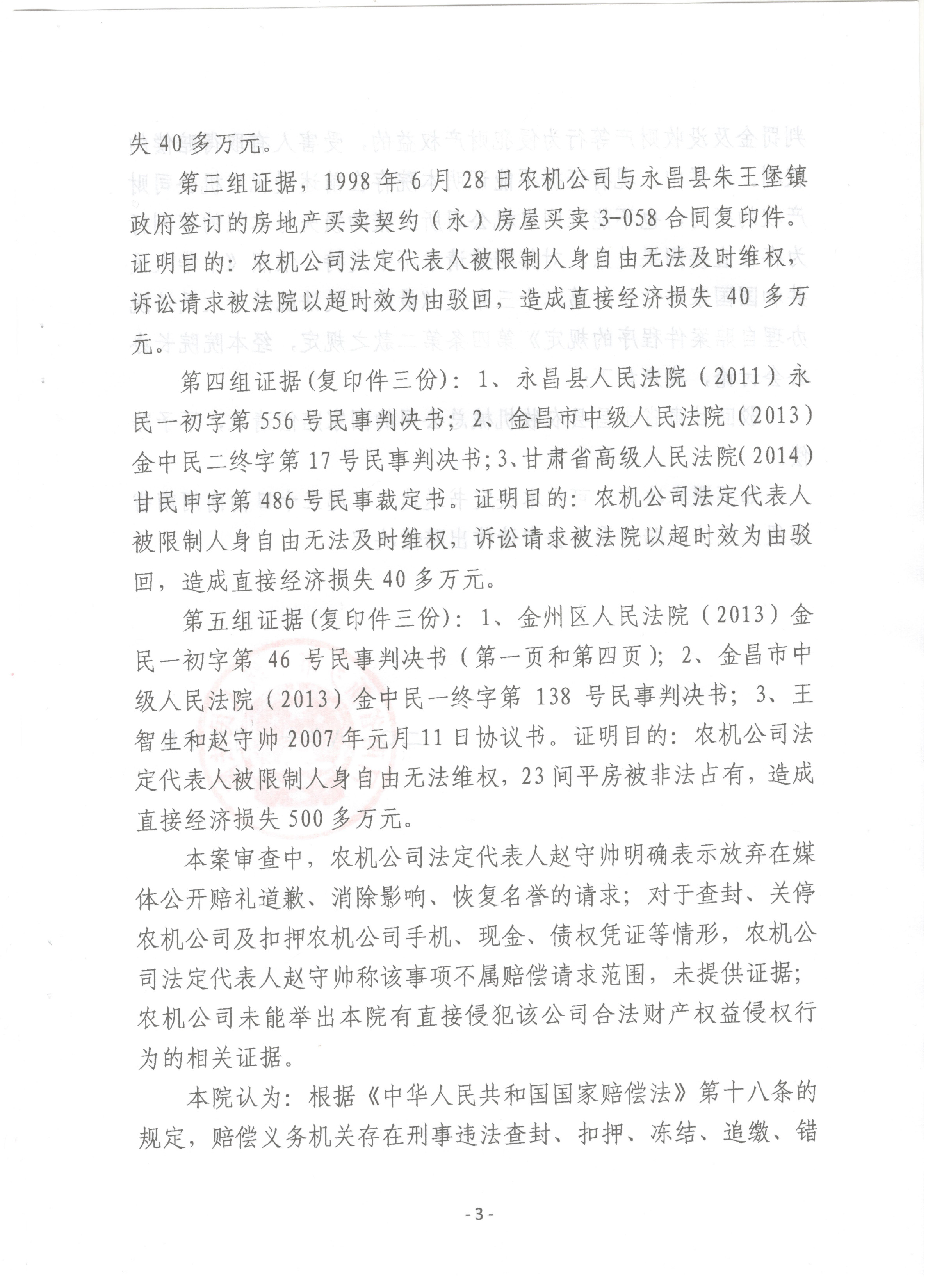 赵守帅申请赔偿永昌县农机公司固定资产、损失差额及诉讼时效丧失的债权损失1.6亿元。赔偿永昌县农机公司、分公司及农机商贸城的停产、停业损失20亿元,共21.6亿元。同时还要求该院在澎湃新闻、中央电视台等媒体公开赔礼道歉、消除影响、恢复名誉、恢复永昌县农机公司正常生产运营。
