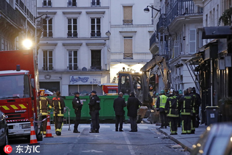 当地时间2019年1月13日,法国巴黎,据法国内政部和法国媒体13日消息,12日巴黎市第九区发生的爆炸事件遇难者人数已升至4人。图为急救人员和消防员在爆炸事故现场。