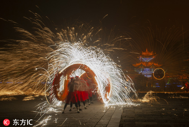 1月13日晚,在山东省枣庄市台儿庄古城,民间表演队为游客表演“火龙钢花”。 “火龙钢花”有着千余年的历史,是中国第一批非物质文化遗产中的杰出代表。它是集造型、表演、激越火爆于一身的民间传统艺术,以“火”为主要特色。舞龙的小伙子赤膊上阵,用掺杂着1500摄氏度铁水和特制的液体拍打至高空撒出“钢花”,瞬间铁水绽放成为耀眼“星光”,一朵朵绽放的“钢花”与“火龙”互相交融,形成了一幅幅震撼且唯美的画面。