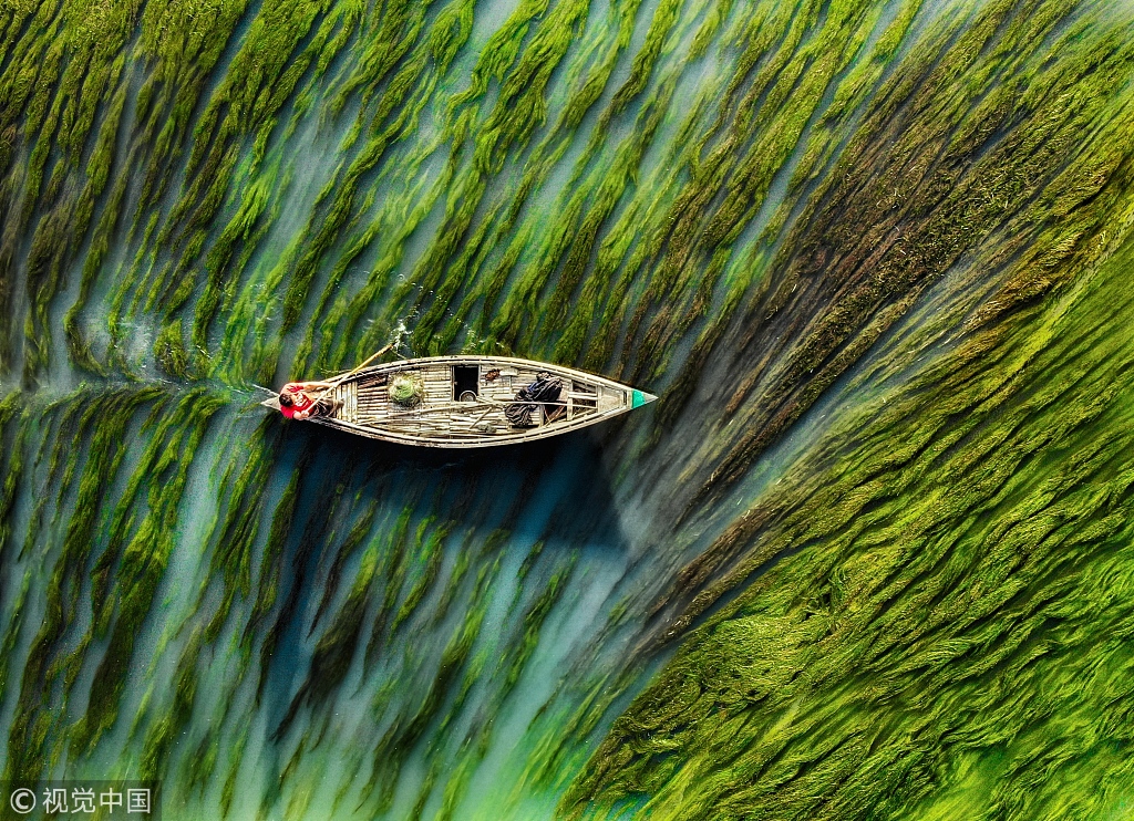 2019年1月14日讯,孟加拉国乌拉帕拉,渔船在水流和藻类的映衬下前行,画面看起来就像水彩画一般。