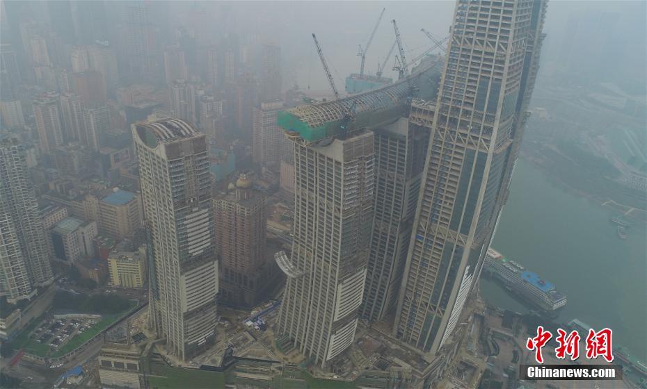 1月14日20时许,随着最后一块幕墙单元体在重庆来福士被提升至200米高空,中国首个超250米高“空中连廊”幕墙工程顺利合拢。该工程创下全球最高、最重、最大、最险的幕墙单元体提升等多个世界之最。图为正在施工中的“空中连廊”。文/钟旖 受访者供图