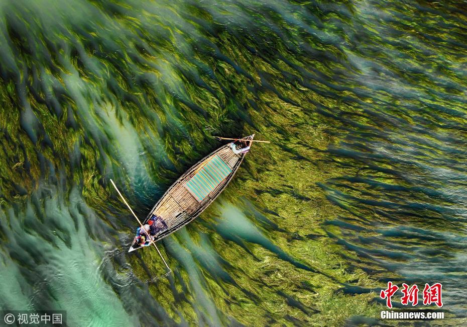 1月14日讯(具体拍摄时间不详),孟加拉国乌拉帕拉,渔船在水流和藻类的映衬下前行,画面看起来就像水彩画一般。图片来源:视觉中国