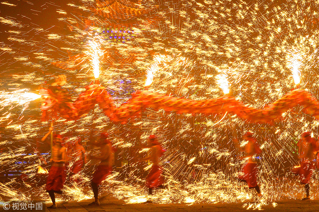 台儿庄古城上演非遗“火龙钢花”迎新春