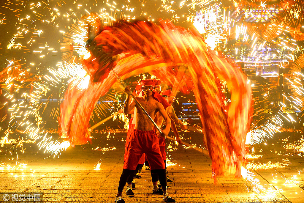 2019年1月13日,民间艺人在山东省枣庄市台儿庄古城表演“火龙钢花”。“火龙钢花”是我国第一批国家级非物质文化遗产,有着“中华第一龙”的美誉。