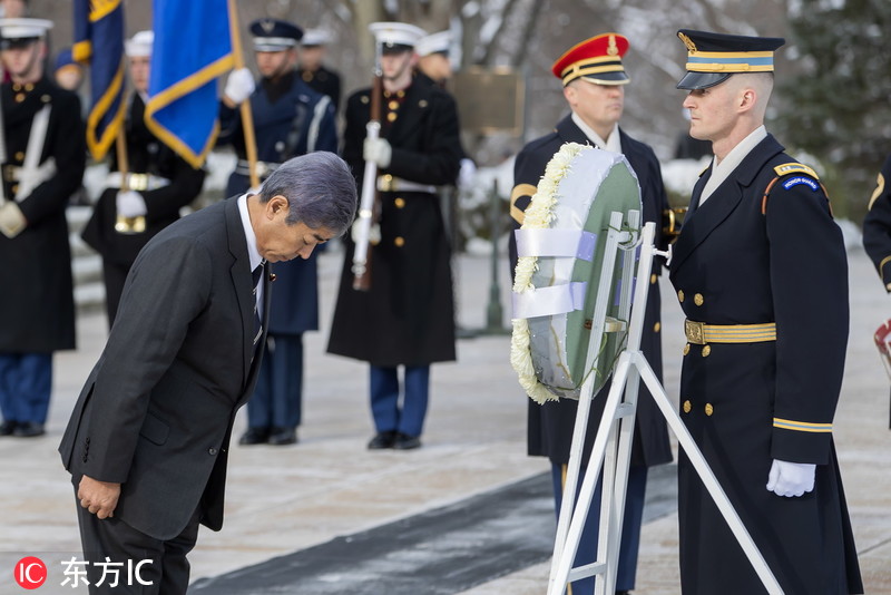 当地时间2019年1月15日,美国弗吉尼亚州阿灵顿,日本防卫大臣岩屋毅出访美国,在阿灵顿国家公墓向无名将士墓进献花圈。