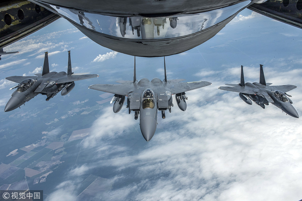 当地时间2018年6月15日, 美国北卡罗来纳州,在西摩·约翰逊空军基地,KC-135同温层加油机刚刚为美国空军第4战斗机联队F-15E攻击鹰战斗机空中加油完毕。
