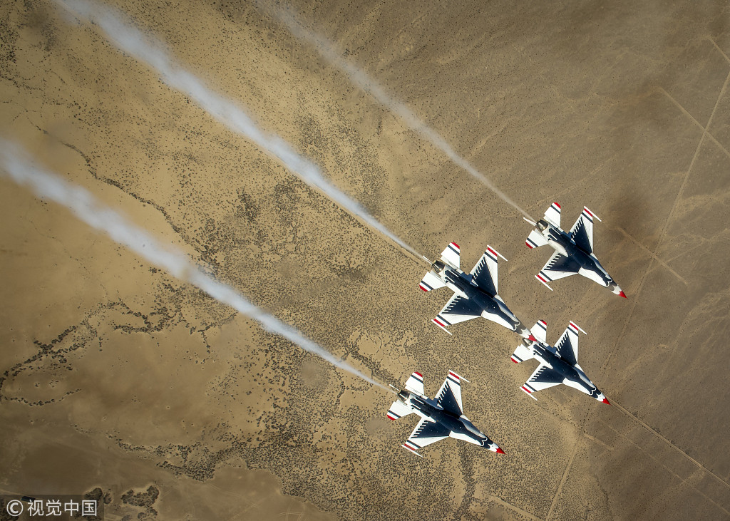当地时间2018年2月28日,美国内华达州,美国空军雷鸟钻石编队的飞行员进行训练飞行。