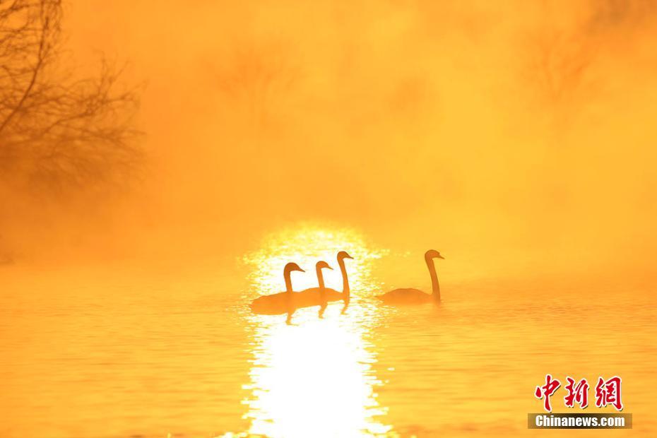 近日,新疆伊宁县英塔木乡的天鹅泉湿地,上百只天鹅在雾气中“起舞”。每年都会有200余只天鹅在这里的湿地过冬,其中90%为疣鼻天鹅。文/耿丹丹 图/崔明浩