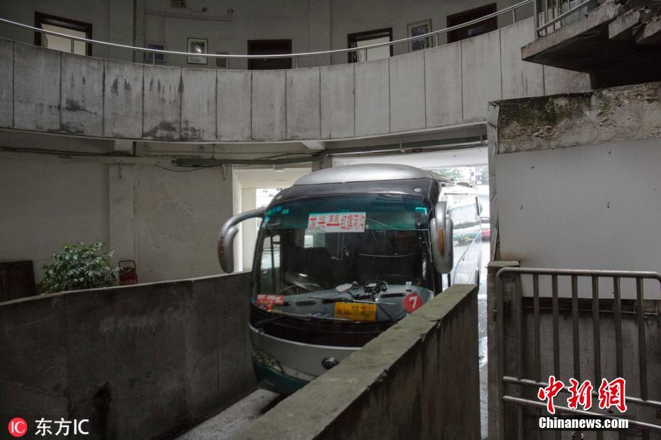 重庆除了轻轨穿楼还有汽车穿楼 9层空心圆筒通行大客车