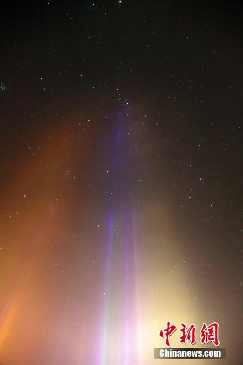 寒冬时节,新疆阿勒泰山区的禾木村,低温可达到零下30摄氏度以下,而在夜晚会更加寒冷。近日,位于极寒山区的禾木村连续出现罕见而有趣的自然奇观——“寒夜光柱”,如利剑般的彩色光柱直插星空,酷似科幻大片!“寒夜光柱”是一种自然界的反射原理现象,只有在非常寒冷的夜里才有可能发生,美丽程度可与极光比肩,其形成是靠空气中大量冰晶(雪花)的反射。据介绍,雪花是六边形,灯光通过这些冰晶如镜面般反射光线,再传到人眼里,人眼看到的就是一个被向上反射的光柱虚像。越冷的地方大气中冰晶越多,所形成的反射通常也就越强。雷东翔 摄