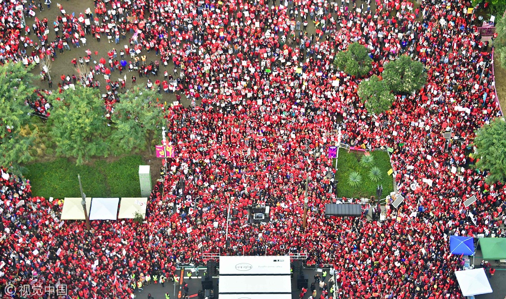当地时间2019年1月18日,美国加州洛杉矶,数千民教师和支持者在市政厅外集会,全国第二大教师工会的罢工已经进入第五天,谈判仍在继续。来源:视觉中国