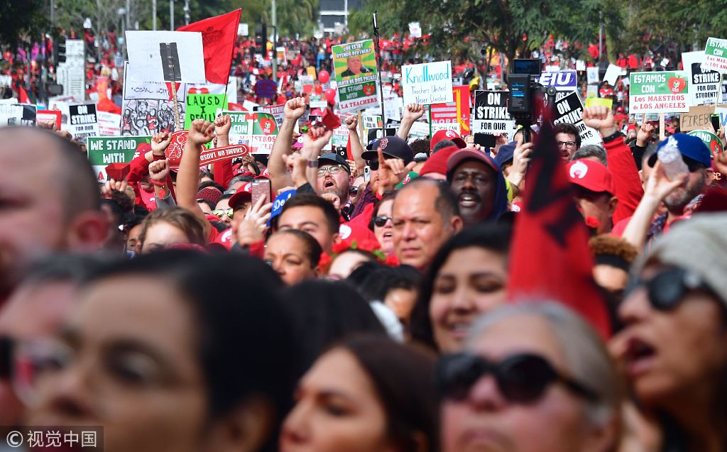 当地时间2019年1月18日,美国加州洛杉矶,数千民教师和支持者在市政厅外集会,全国第二大教师工会的罢工已经进入第五天,谈判仍在继续。来源:视觉中国