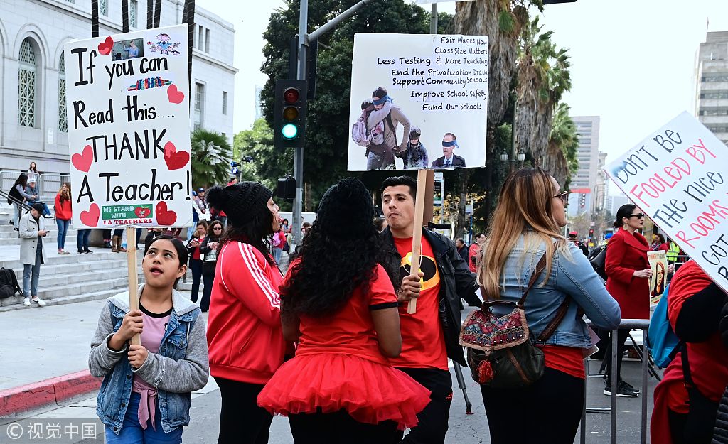 当地时间2019年1月18日,美国加州洛杉矶,数千民教师和支持者在市政厅外集会,全国第二大教师工会的罢工已经进入第五天,谈判仍在继续。来源:视觉中国