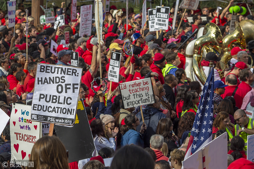 当地时间2019年1月18日,美国加州洛杉矶,数千民教师和支持者在市政厅外集会,全国第二大教师工会的罢工已经进入第五天,谈判仍在继续。来源:视觉中国