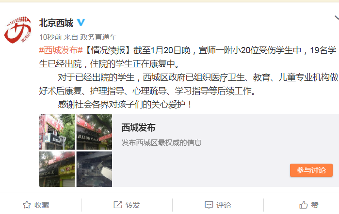 北京市西城区政府新闻办公室今天下午通报“宣师一附小男子伤害学生事件”后续:截至1月20日晚,宣师一附小20位受伤学生中,19名学生已经出院,住院的学生正在康复中。