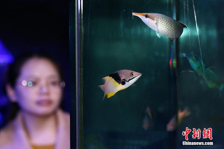 1月21日,有着华丽外表、俊俏容颜的热带海洋鱼类亮相南京海底世界,为新年添色。图为观众欣赏中胸普提鱼。 泱波 摄