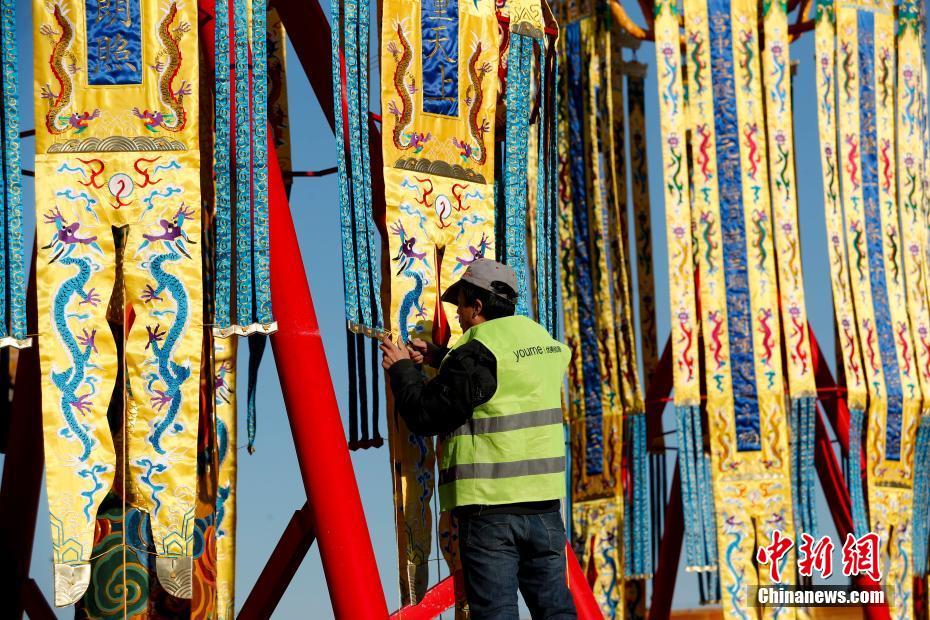 1月21日,北京故宫博物院在乾清宫前丹陛上下树立起“天灯”和“万寿灯”各一对,作为“贺岁迎祥——紫禁城里过大年”展览的实景体验部分正式向观众开放。清代宫廷沿明代旧制,元旦(即今日春节)前后要在乾清宫丹陛上下各立一对天灯和万寿灯,乾隆五十四年开始在皇极殿各增立一对。按《国朝宫史》记载,每年十二月二十四日安设天灯万寿灯。天灯至次年二月初三撤出,万寿灯至正月十八日撤出。立天灯、万寿灯是清代早中期过年最盛大的活动之一。中新社记者 杜洋 摄