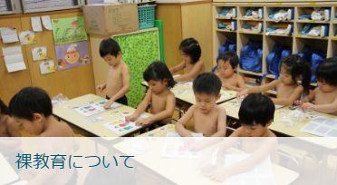 4. 裸教育に踏み切ったのは、裸教育で成果を上げている幼稚園見学や研究の成果である。4月から10月までは短パンひとつの裸。当初は、11月から3月までは薄着とした。薄着の期間も出来るだけ裸を奨励する。園児は登園と同時に脱衣して午後2時10分の帰宅時刻まで裸である。→ 规定每年4-10月只穿短裤、上身裸体。11月-次年3月穿薄衣服。 建议即使是穿薄衣服的时节,也尽量赤身裸体,裸体有奖。