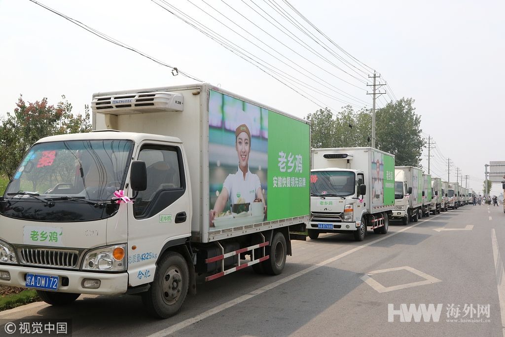 2015年9月18日,安徽合肥,90后小伙开强是某品牌快餐店冷链物流车的一名司机,当天是他新婚大喜的日子,他所在的车队出动了一百辆冷链物流车,贴上了大红的喜字和彩带为他接亲。图片作者:郑洲/视觉中国