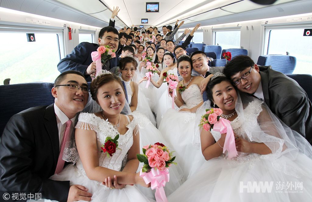 2014年08月16日,吉林省长春市,190对新人乘价值1.95亿元动车组婚车完成集体婚礼。 图片作者:董竞琦/视觉中国