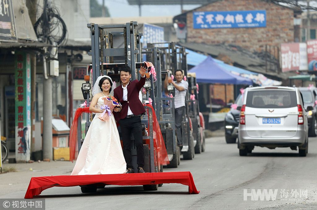 2014年10月14日,广西柳州,木业厂老板用“叉车送亲”的方式为新人送祝福。新人坐站在叉车上。图片作者:颜篁/视觉中国