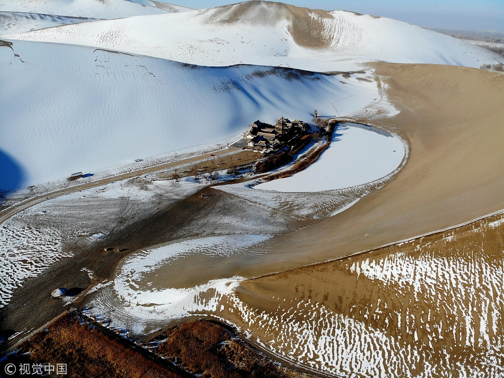 2019年1月21日,甘肃酒泉,航拍雪后的敦煌市鸣沙山月牙泉景区雪景如画、美不胜收。