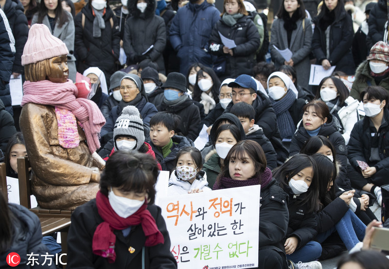 当地时间2019年1月23日,韩国首尔,韩国示威者聚集在日本大使馆前,举行周三例行集会,敦促日本政府解决慰安妇问题,前慰安妇受害者出席。当天首尔遭遇雾霾天气,示威现场不少民众戴起口罩。