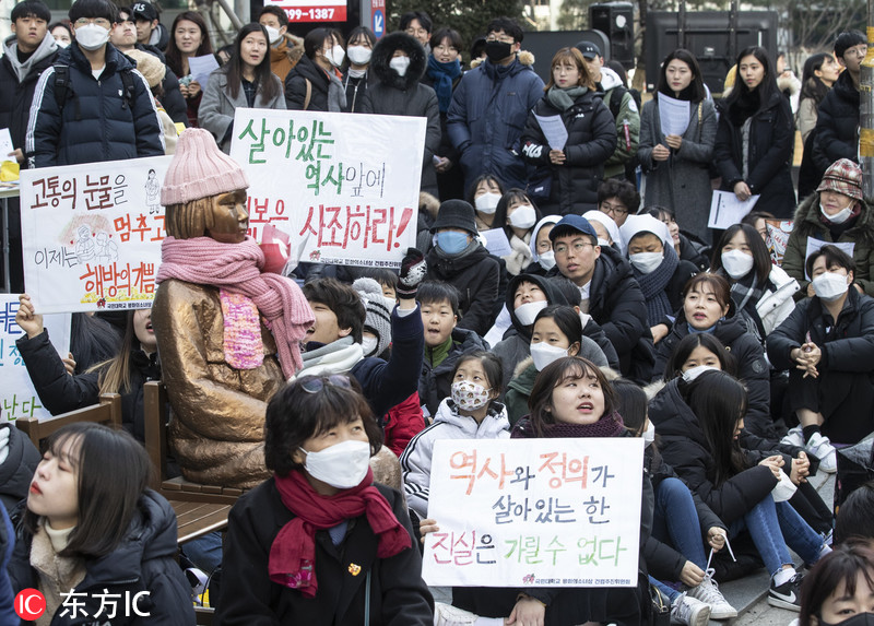 当地时间2019年1月23日,韩国首尔,韩国示威者聚集在日本大使馆前,举行周三例行集会,敦促日本政府解决慰安妇问题,前慰安妇受害者出席。当天首尔遭遇雾霾天气,示威现场不少民众戴起口罩。