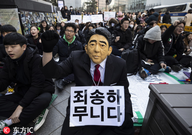 韩民众顶雾霾参加周三集会 扮“安倍”敦促日本解决慰安妇问题