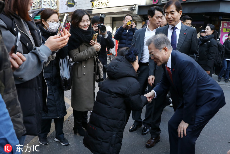 当地时间2019年1月24日,韩国大田,韩国总统文在寅造访当地,与民众亲切互动。文在寅正在进行全国经济巡访,大田是第五站。