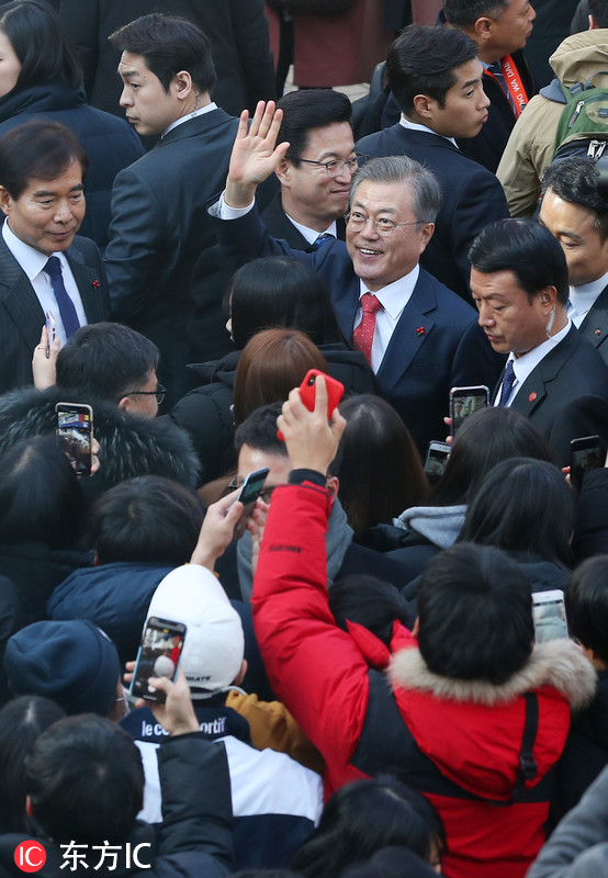 当地时间2019年1月24日,韩国大田,韩国总统文在寅造访当地,与民众亲切互动。文在寅正在进行全国经济巡访,大田是第五站。