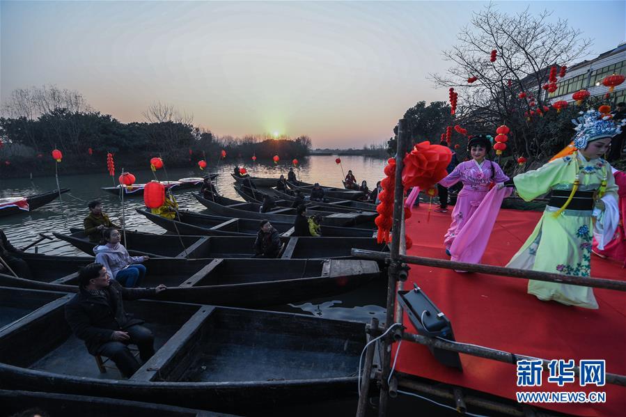 1月23日,百姓坐着渔船观看传统的水乡社戏。新华社记者 徐昱摄