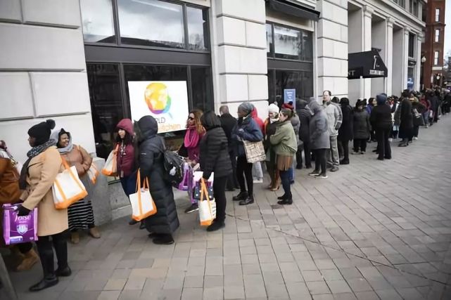 冬日里,华盛顿哥伦比亚特区道路上行人稀少、商户门厅冷清,但在国家广场附近一处街角却见人排起了长队。