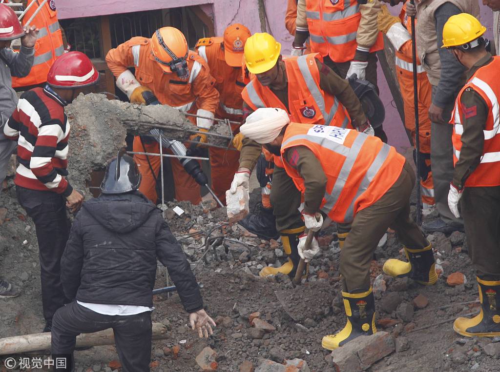 当地时间2019年1月24日,印度Gurugram,Ullahawas村的一栋四层在建建筑倒塌,消防队和救援人员正展开救援行动。事故造成至少7人死亡。